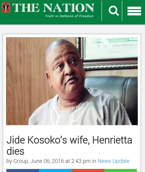 Nollywood actress, Henrietta Kosoko, wife of veteran actor, Jide Kosoko is dead. She died on Monday morning.