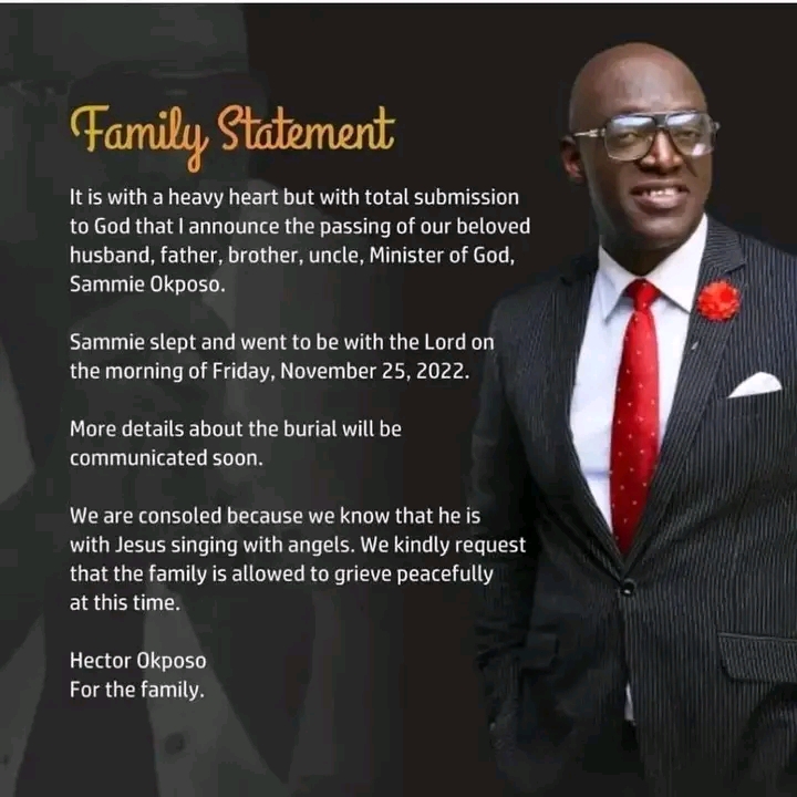 The family of popular Nigerian Gospel singer and Welu Welu crooner, Sammie Okposo has released official statement regarding his sudden death.