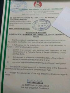 The EFCC said, “The commission is investigating a case of contract scam in which the need for clarification from your office has become imperative. In furtherance to the investigation, you are kindly requested to furnish us with the following information; confirm if a contact was awarded and approved for the construction of a perimeter fence at Federal University, Gusau, Zamfara State.