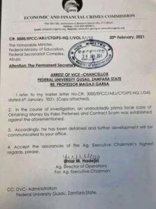 In the second letter, titled, “Arrest of Vice-Chancellor, Federal University Gusau, Zamfara State,” signed by the same EFCC official, the agency wrote, “In the course of investigation, an undoubtedly prima facie case of obtaining money by false pretences and contract scam was established against the aforementioned. Accordingly, he has been detained and further development will be communicated to your office.”