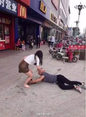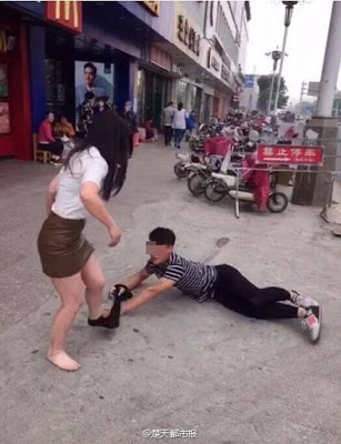 A man held his (ex-)girlfriend’s leg to beg her not to break up in street of China‬ recently. He was so desperate that he pulled stockings of the girl off. A group of audience gathered to watch the drama. The girl got extremely furious; she slapped the man on the face 12 times. But even this did not stop him from trying. The girl eventually had to run away barefooted. The photos quickly went viral online.