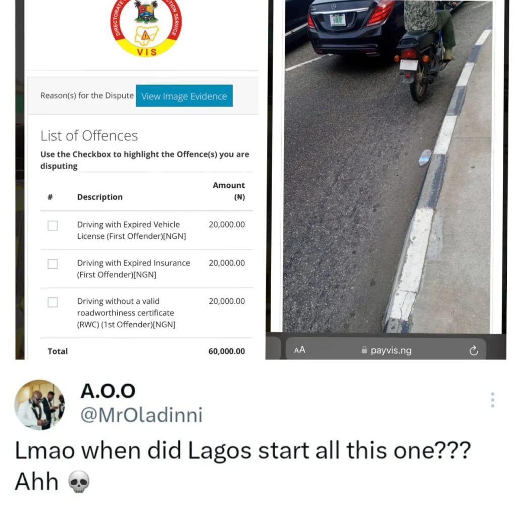 A Nigerian man residing in Lagos state has taken to Twitter to lament after he was sent an automated billing ticket of N60, 000 for breaking the law.