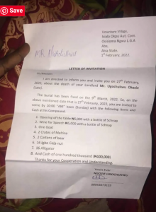 He shared the letter addressed to him with the caption, “You never see anything sef . My landlord just died and his son wrote a list of items that I will give to him as his tenant for his burial rites.”