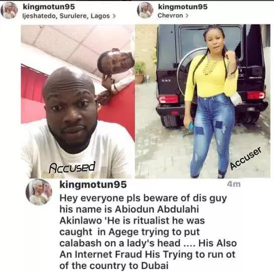 According to a lady, @kingmotun95, who raised the alarm on Instagram, Abiodun is a ritualist who was caught in Agege while in the process of putting a calabash on a lady’s head. She also alleged that he is an internet fraudster, a term many popular know as yahoo yahoo.