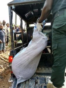 A lady said to be pregnant was killed by suspected ritualists, stacked in a a bag and dumped at Amachara, Umuahia South LGA of Abia State by the side of Assemblies of God Church after Amachara Specialist Hospital.