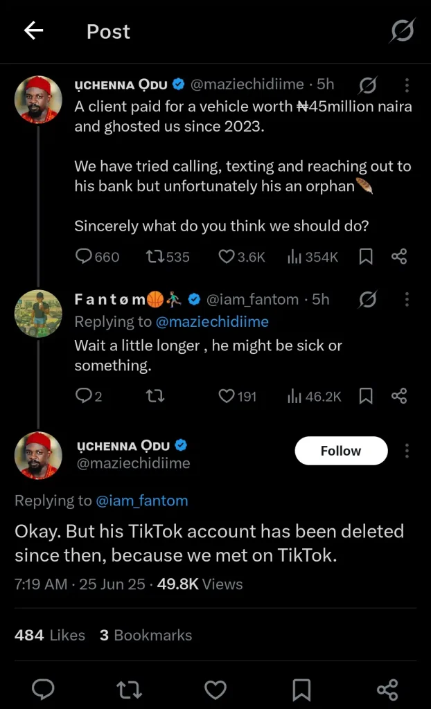 “A client paid for a vehicle worth ₦45 million naira and ghosted us since 2023,” he wrote. “We have tried calling, texting, and reaching out to his bank but unfortunately, he’s an orphan.”