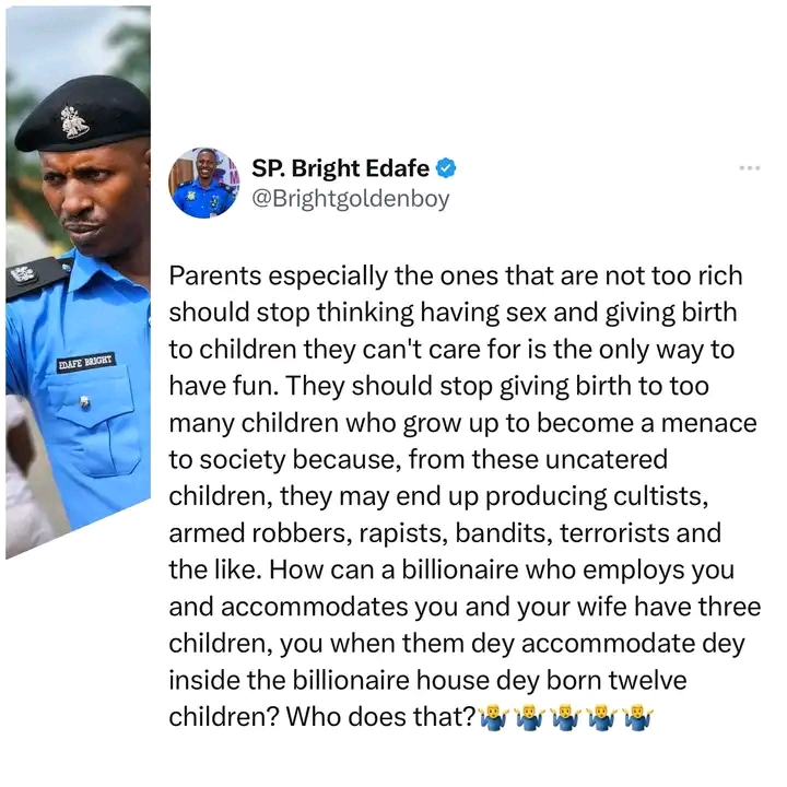 In a post on his official social media page on Saturday, Delta State Police Public Relations Officer, SP Bright Edafe, has warned parents to stop giving birth to too manye children.