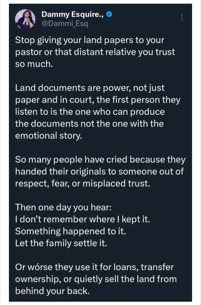 A Nigerian lawyer, Dammy Esquire, has issued a strong warning to Nigerians, urging them to stop entrusting their land documents to pastors, friends, or relatives, no matter how trustworthy they seem.