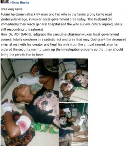 Suspected Fulani herdsmen have allegedly killed a Tiv man and injured his wife in Wukari Local Government Area of Taraba state.