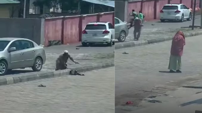 A Facebook user, Emeka Gift Official, shared the incident in a post accompanied by a photo showing a man appearing to struggle on the pavement, presumably escaping the bee attack. Scattered slippers and deserted surroundings indicate the chaos that unfolded.