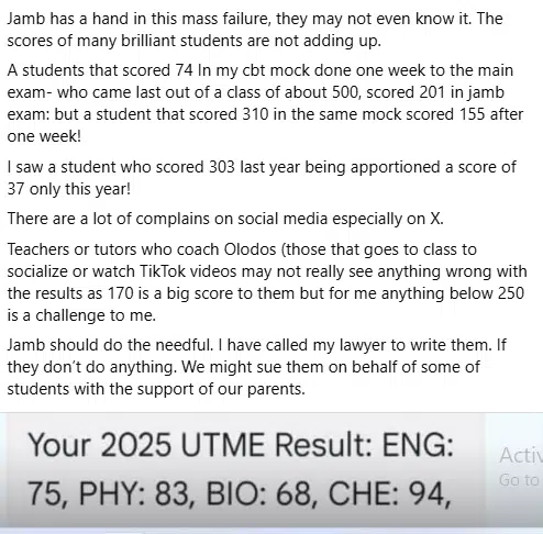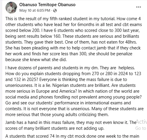The teacher also revealed that he has received complaints from numerous parents whose children are experiencing similarly poor UTME results, suggesting that the issue may be more widespread than initially believed.