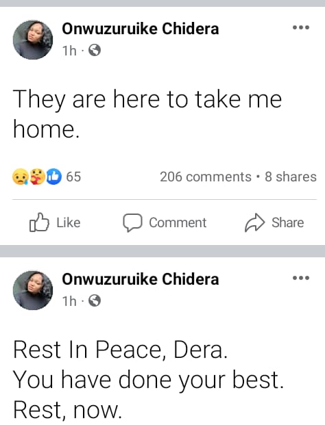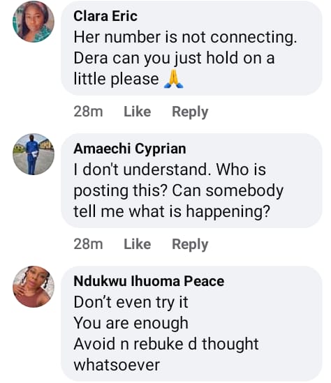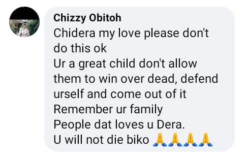 “Please, who ever that knows where Onwuzuruike Chidera lives in Portharcourt should please go and check up on her. My friend is battling chronic clinical depression and I came online to see her posing cryptic suicidal message on her page on Facebook. She is not taking my calls as I have been calling her for the past 30 minutes,” he said.