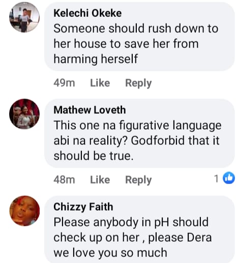 A Port Harcourt based woman, Onwuzuruike Chidera, has got friends worried after she posted suicidal notes on Facebook.