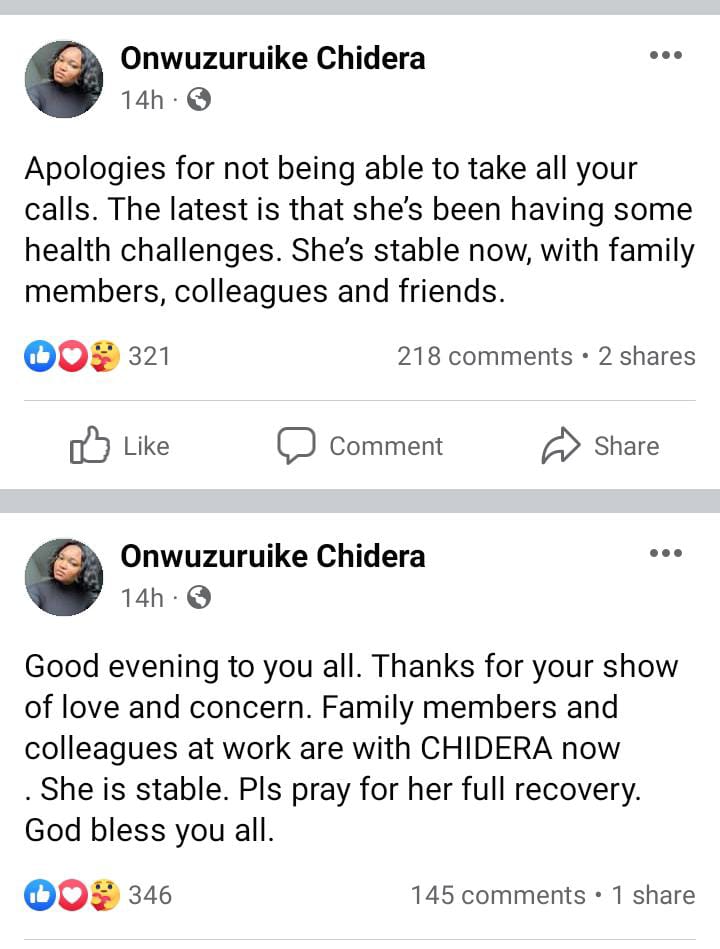 “Good evening to you all. Thanks for your show of love and concern. Family members and colleagues at work are with CHIDERA now. She is stable. Pls pray for her full recovery. God bless you all”.
