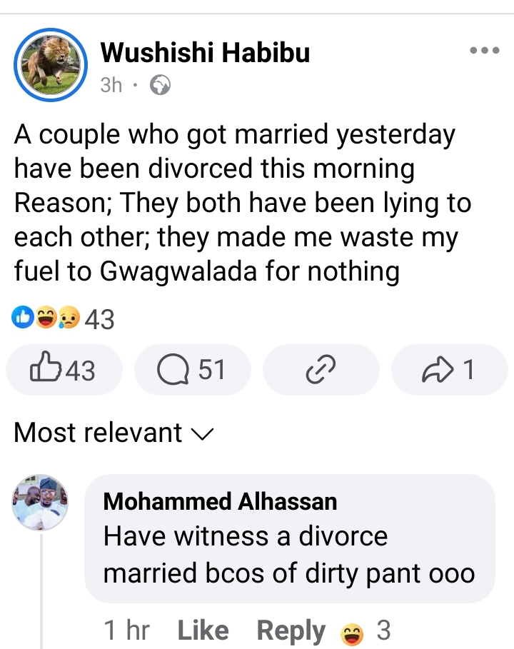 “A couple who got married yesterday have been divorced this morning Reason; They both have been lying to each other; they made me waste my fuel to Gwagwalada for nothing,” he wrote on Sunday.