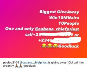 Paul then hit back by releasing Cubana Chief Priest’s phone numbers and asking people to call him for N10 million giveaway.