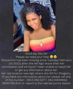 Good day Ma/Sir Please we need your help Omowunmi has been missing since Tuesday (February 1st 2022) after she left Ago Iwoye after her convocation and we haven’t been able to reach her or get any information about her.