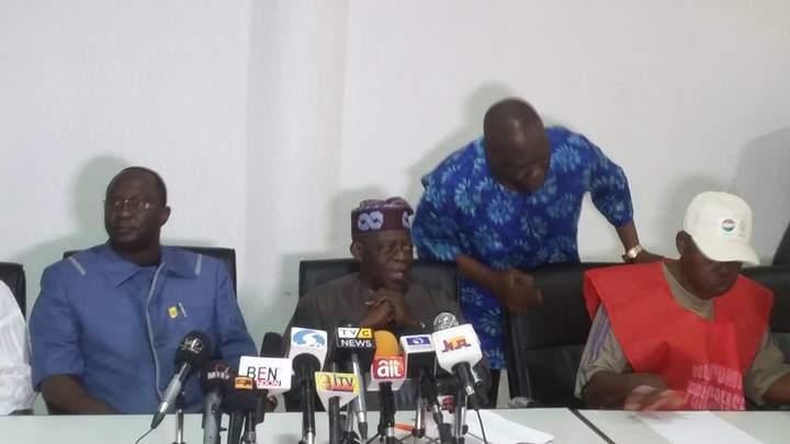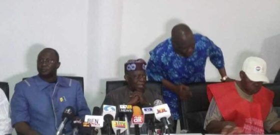 Tinubu, accompanied by some officials of the APC and Governor Rauf Aregbesola, said he came on behalf of his party, the Buhari government to appeal to the labour leaders to end the strike and return to the negotiating table.