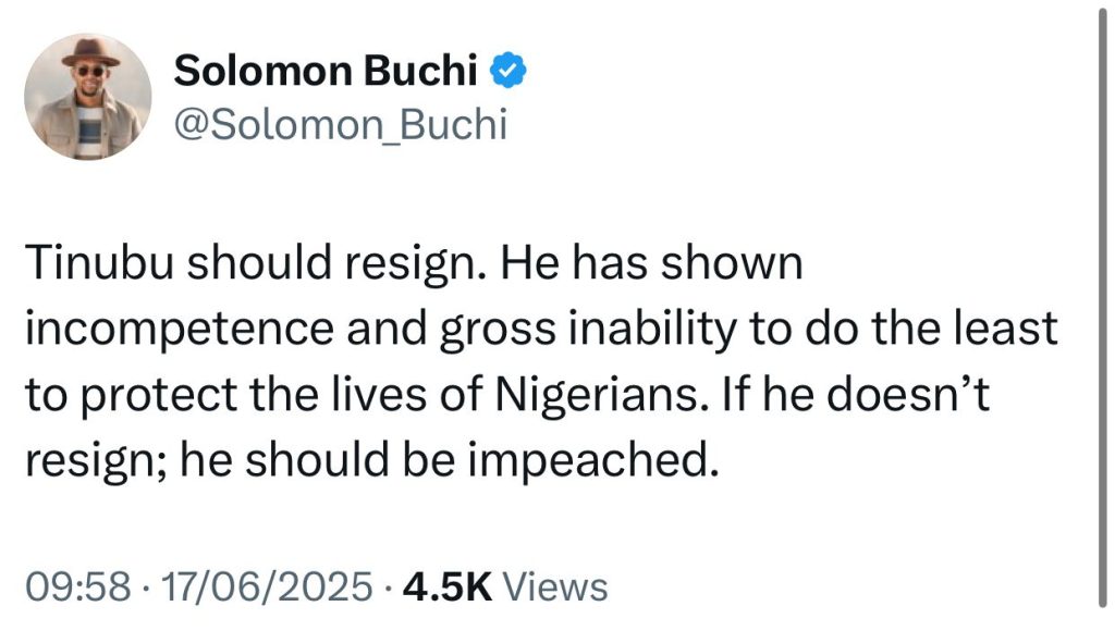 As Nigerians continue to condemn the recent attacks in Benue state where over 200 persons were k!lled by suspected terrorists and bandits, Nigerian writer and life coach, Solomon Buchi, says President Tinubu has showed incompetence and gross inability to protect the lives of Nigerians and need to resign or be impeached from office.