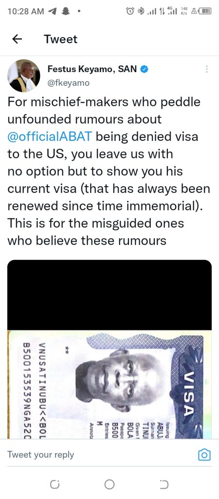 Keyamo’s tweet read: “For mischief-makers who peddle unfounded rumours about @officialABAT being denied visa to the US, you leave us with no option but to show you his current visa (that has always been renewed since time immemorial). This is for the misguided ones who believe these rumours.”