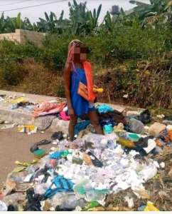 Earlier today, a uniuyo student whose photos appear below ran mad, after she was dumped by unknown people, close to the waste bin around NEW RING ROAD THREE BY UBOTEX U-TURN.