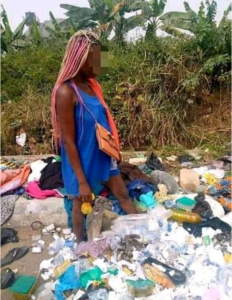Earlier today, a uniuyo student whose photos appear below ran mad, after she was dumped by unknown people, close to the waste bin around NEW RING ROAD THREE BY UBOTEX U-TURN.