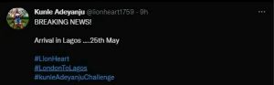 Kunle announces on his twitter page to arrive Lagos May 25th.