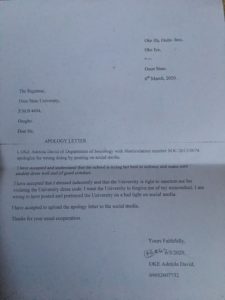 A student of the Osun State University, Oke Adetola David has written an apology letter after accusing the Vice Chancellor of stripping him naked over a dress he wore to school.