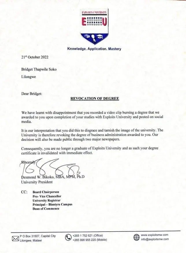 President of Exploits University, Dr. Desmond Bikoko, in the letter dated 21st October, 2022, said burning her certificate is a disgrace and it is taken to mean she wishes to tarnish the image of the school.