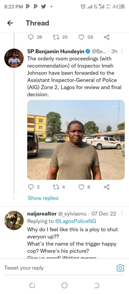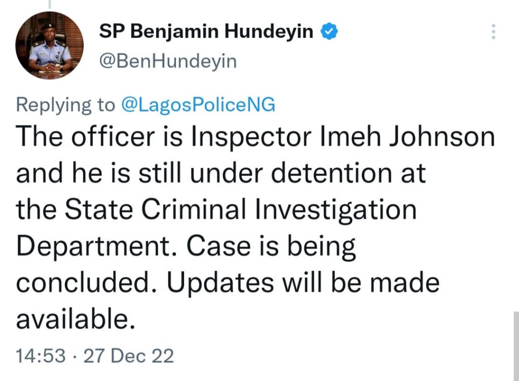 Hundeyin shared Inspector Imeh’s photo and stated that the orderly room proceedings (with recommendation) have been forwarded to the Assistant Inspector-General of Police (AIG) Zone 2, Lagos for review and final decision.