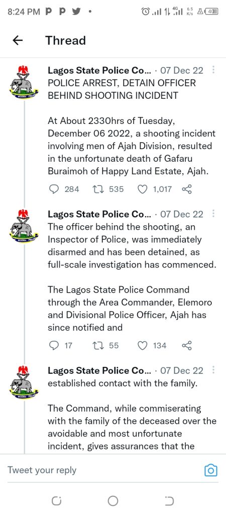 Gafaru was out to buy fuel when the bullet fired by the trigger-happy police officer killed him.
