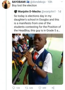 Though his speech moved adult Nigerians, it was up to his fellow students to vote and the students voted for a boy who is “more sociable”.