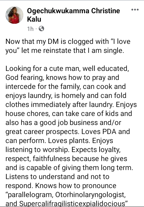 “Now that my DM is clogged with “I love you” let me reinstate that I am single. Looking for a cute man, well educated, God fearing, knows how to pray and intercede for the family, can cook and enjoys laundry, is homely and can fold clothes immediately after laundry. Enjoys house chores, can take care of kids and also has a good job business and/or great career prospects. Loves PDA and can perform. Loves plants. Enjoys listening to worship. Expects loyalty, respect, faithfulness because he gives and is capable of giving them long term. Listens to understand and not to respond. Knows how to pronounce “parallelogram, Otorhinolaryngologist, and Supercalifragilisticexpialidocious”