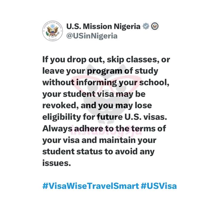 “If you drop out, skip classes, or leave your program of study without informing your school, your student visa may be revoked, and you may lose eligibility for future U.S. visas”, The tweet stated.