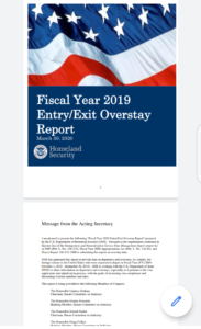 The DHS 2019 Entry/Exit Overstay Report provided data on expected departures and overstays for foreign travelers who entered as nonimmigrants through air or sea port of entry (POEs) and who were expected to depart between October 1, 2018 and September 30, 2019.
