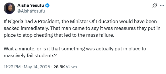 Activist, Aisha Yesufu, has said that if ‘Nigeria had a President,’ the Minister of Education, Tunji Alausa, would have been sacked by now, following the revelation made by the registrar of JAMB, Prof Ishaq Oloyede.