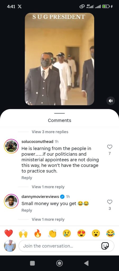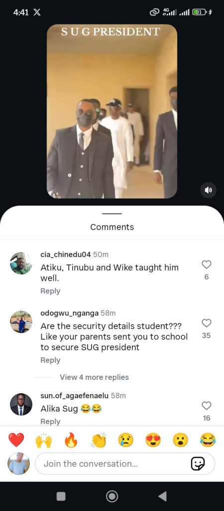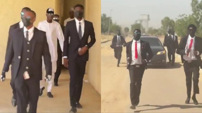 The viral video shows the SUG President in a white native attire, surrounded by men and women in suits, said to be members of his security team.