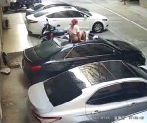 According to reports, the woman jumped from a fourth floor window. She was fortunate to have landed on the roof of a car but it appears she hurt her back.