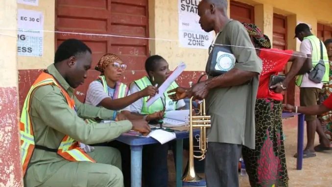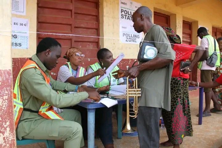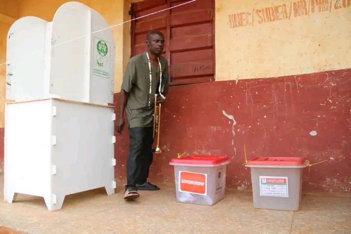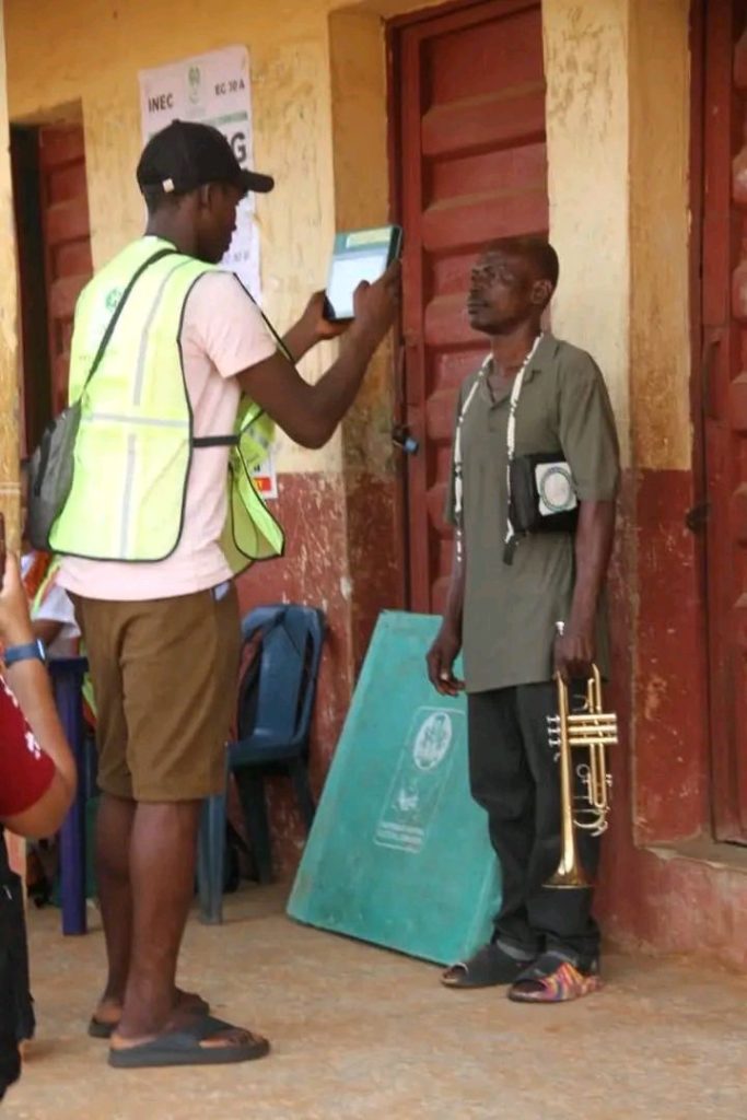 An unidentified man arrived at his polling unit carrying a Bible in one hand and a shining trumpet in the other, turning heads as he prepared to cast his vote in the tightly contested election.