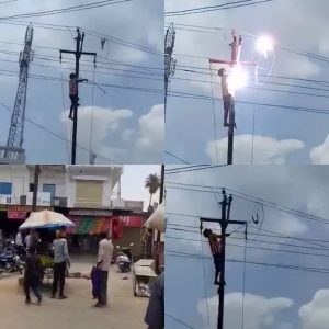 A video shared online captured the moment a man was electrocuted while trying to save a bird trapped on a high tension wire