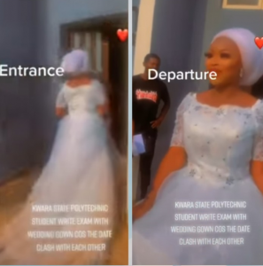 Kwara Polytechnic Student Wears Wedding Gown To Exam Hall because the date clash with each other.
