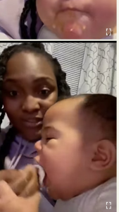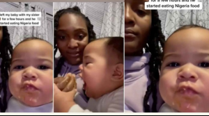 A hilarious moment showing when a woman fed a white kid with eba and okro has been captured on camera, with reactions making waves.