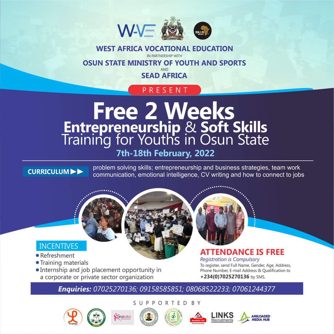 Wave Academy in partnership with Osun State Ministry of Youths and Sports and Sead Africa have announced a free 2 weeks entrepreneurship and soft skills training for youths in Osun State, AMILOADED reports.