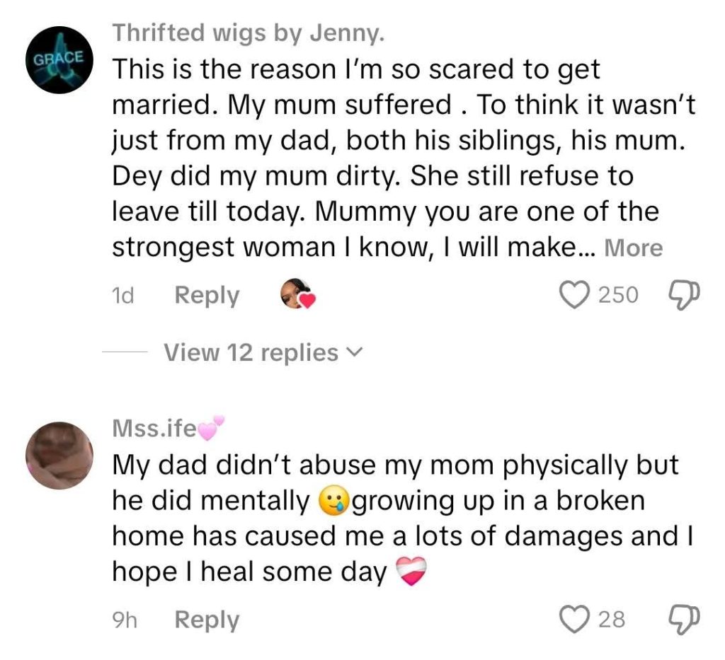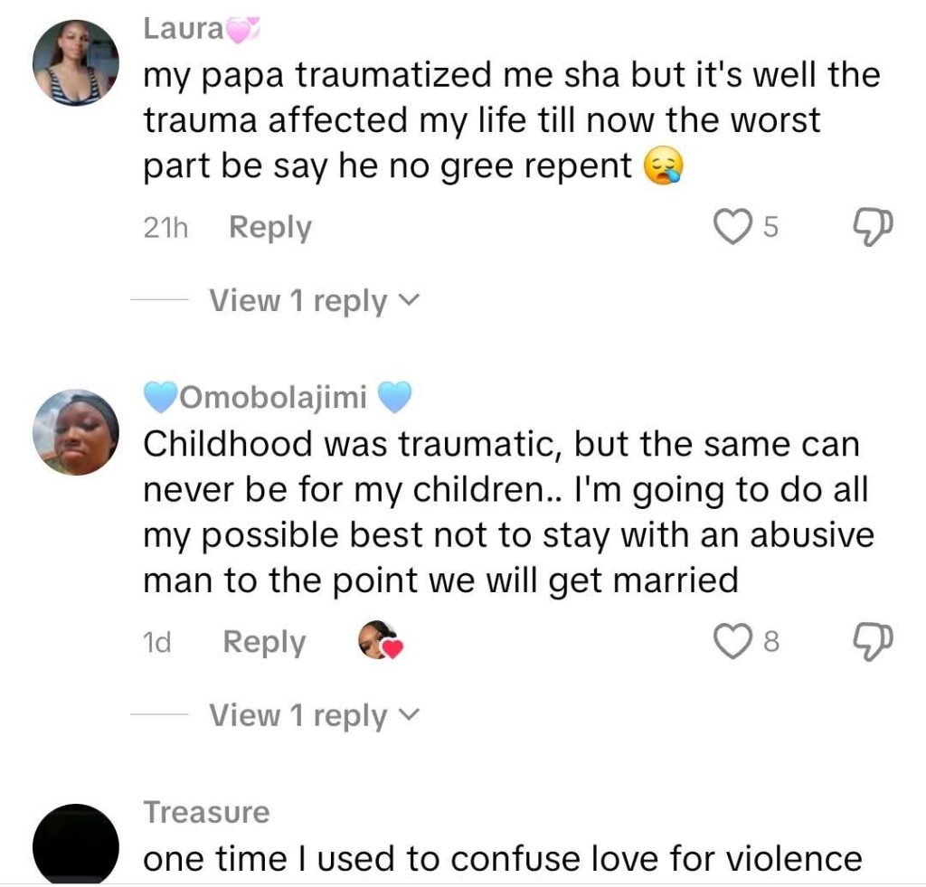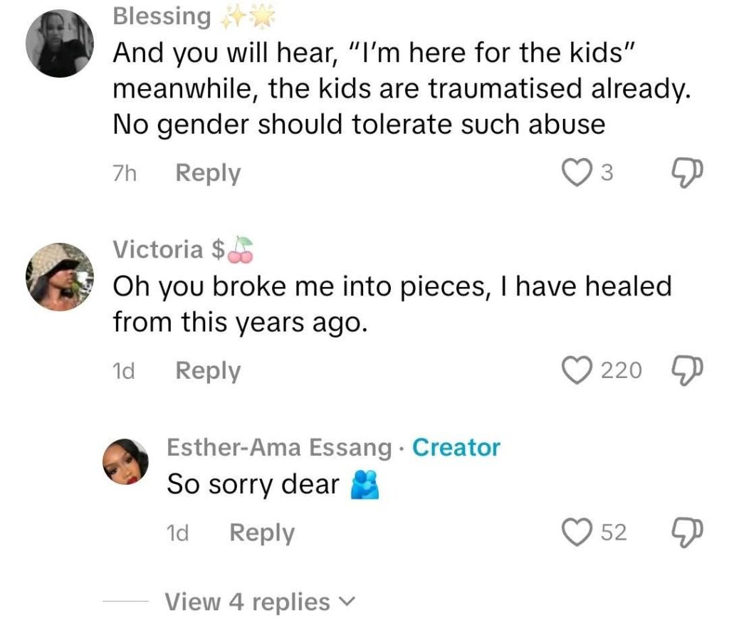 Many of them condemned the idea of women staying with abusive men for the sake of the kids. They stated that they, the kids, were left traumatised and it would have been better if their mothers left.