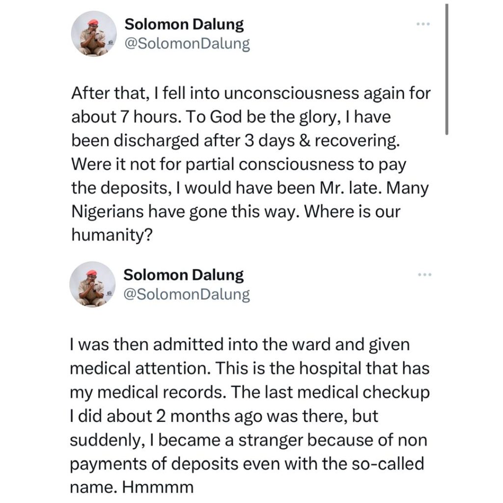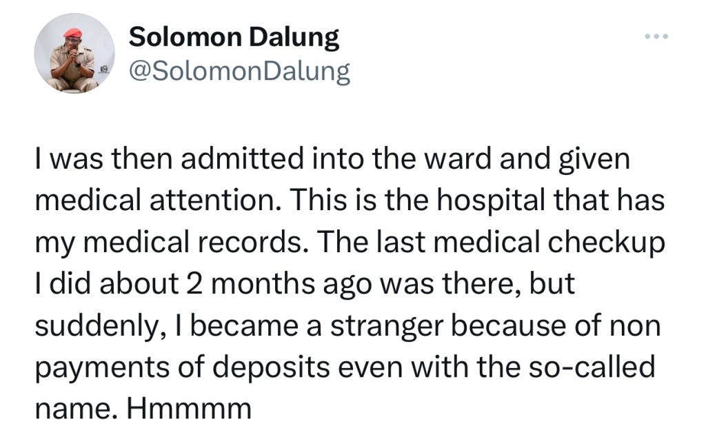 Dalung said he fell ill on Wednesday, May 8, and went to the unnamed hospital for treatment but that the hospital refused to give him treatment because he had yet to make an admission deposit despite holding his medical records. The former minister said he regained partial consciousness later and transferred the deposit before he was attended to.
