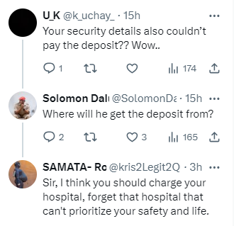 “I took ill on Wednesday, arrived at the hospital & shortly became unconscious after doctor’s interviews. Was ferried into emergency ward but abandoned for over 4 hrs due to non payments of admission deposits. Regained partial consciousness later did the transfer of deposit.