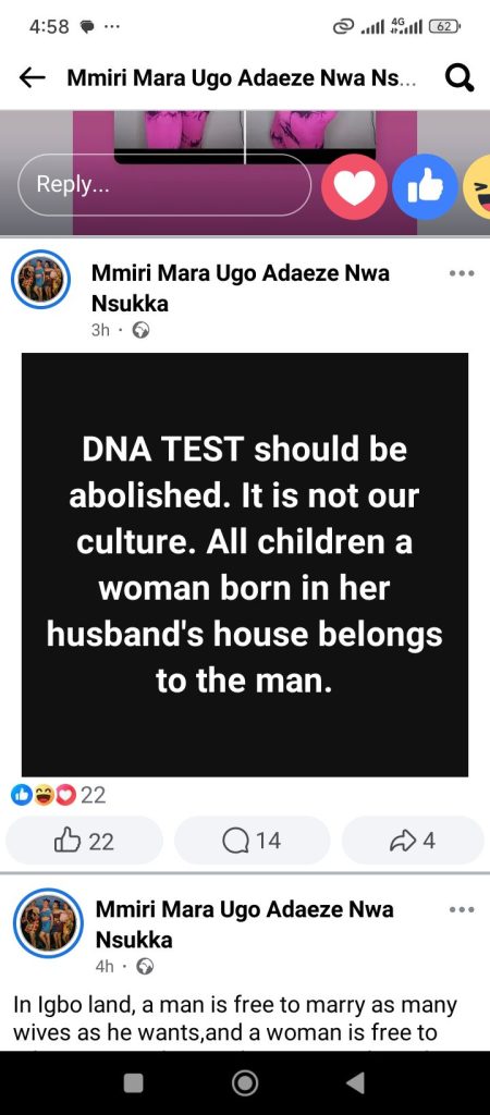 A Facebook user, Mmiri Mara Ugo Adaeze Nwa Nsukka, has called for the abolition of DNA testing, insisting that it is not part of cultural practices.