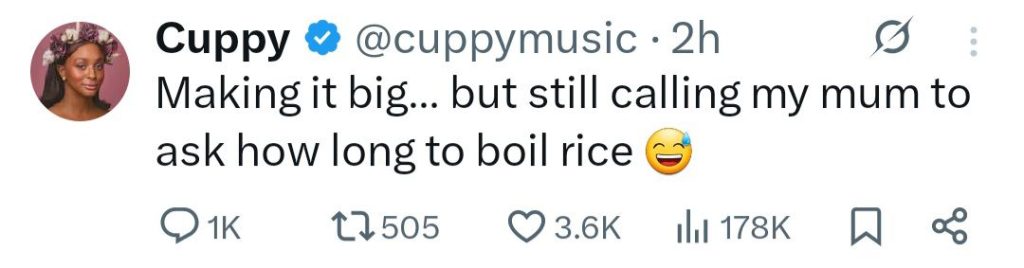 Florence Otedola, better known as DJ Cuppy, has diclosed that she still needs her mother’s guidance to boil rice.