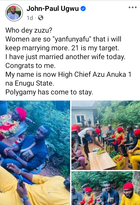 Ugwu, who made the announcement in a Facebook post, said his aim is to marry 21 wives.