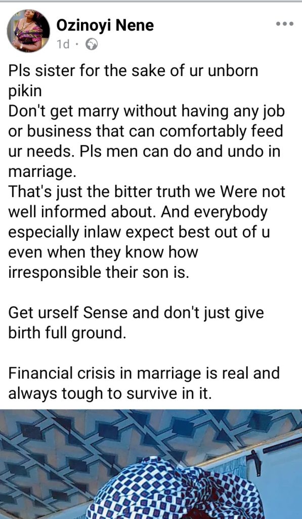 “Pls sister for the sake of ur unborn pikin. Don’t get marry without having any job or business that can comfortably feed ur needs. Pls men can do and undo in marriage. That’s just the bitter truth we Were not well informed about.